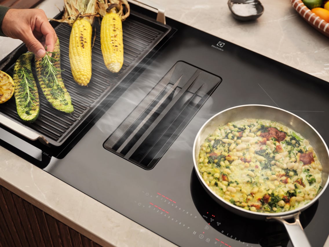Electrolux indukcijske kuhalne plošče z vgrajenimi ventilatorji niso le elegantne, temveč tudi učinkovite. Kuhinja, ki si jo lahko oblikujete po svojih željah, ne bo nič več mastna.