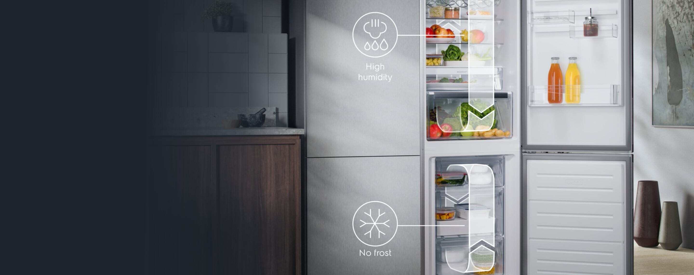 Napredna tehnologija dvojnega hlajenja in neodvisno kroženje zraka zagotavljata, da se zmrznjen suh zrak iz zamrzovalnika ne uporablja za hlajenje hladilnika kot pri standardnih hladilnikih total no frost. In poln zamrzovalnik brez zmrzali pomeni, da vam nikoli več ni treba odmrzovati.