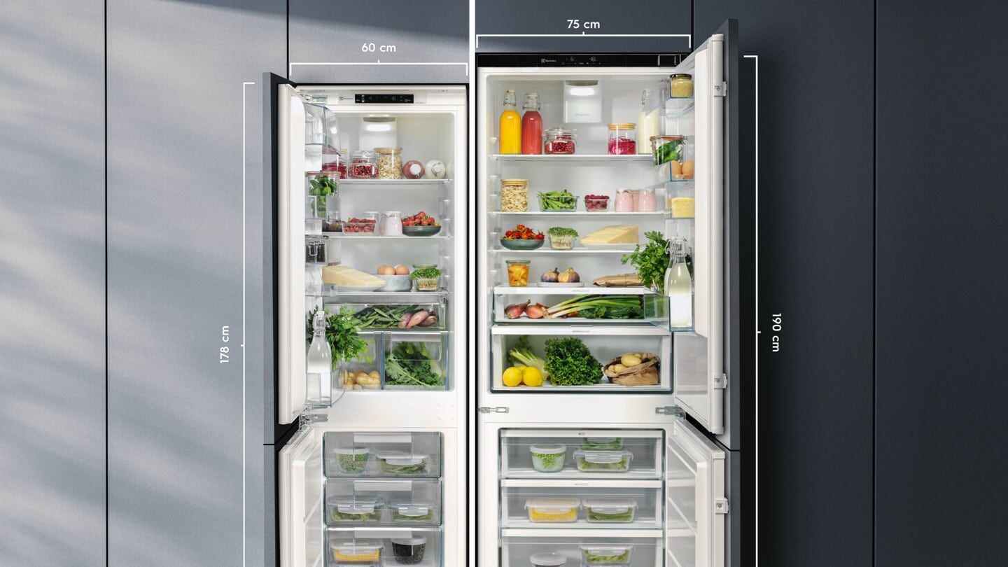 Vgrajeni hladilniki z zamrzovalnikom so običajno v standardnih velikostih, tako da se lahko prilegajo za vrata kuhinjske omare, prostostoječi modeli pa se lahko razlikujejo glede na višino in širino. Naše velikosti niš segajo od 60 cm do 190 cm, kot na primer naš hladilnik z zamrzovalnikom MaxiSpace, ki zagotavlja 45 % večjo zmogljivost kot standardni modeli za vgradnjo. Vse dimenzije so na voljo na naših straneh izdelkov.