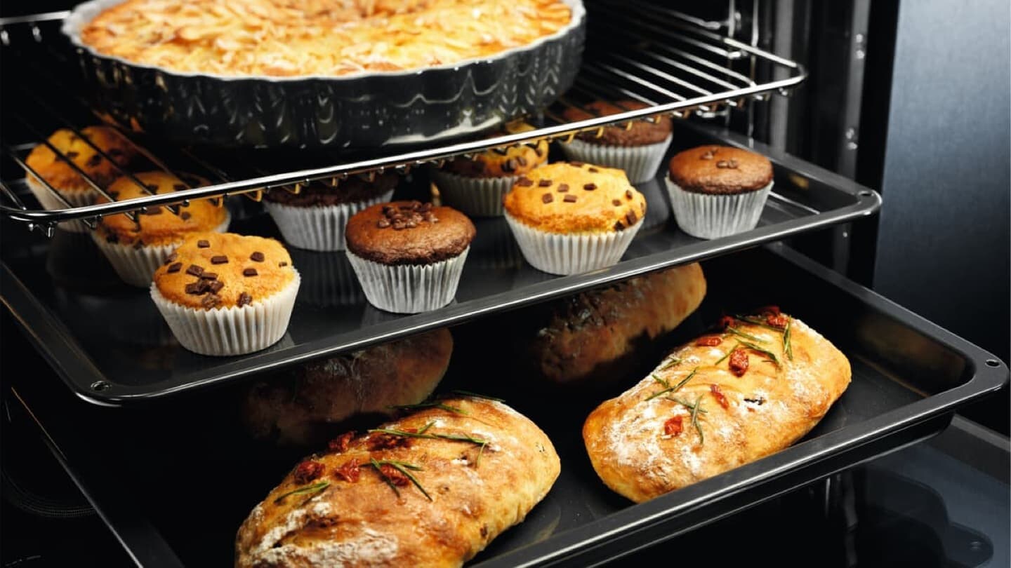 Uživajte ob enakomernem pečenju hrane na več ravneh. Dodatni grelni obroč pomeni, da jedi lahko pečete enakomerno na treh ravneh. Kot nalašč za pripravo slastnih piškotov in okusnih pit.