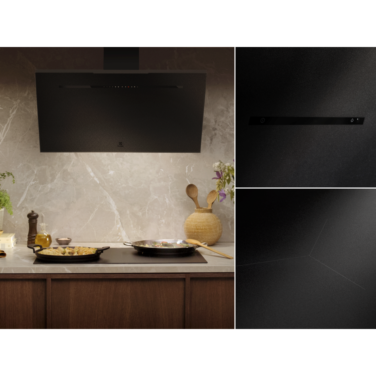 Prefinjena oblika iz teksturiranega mat črnega stekla. Napa se brezhibno zlije s kuhalno ploščo SaphirMatt® in mat črno kuhinjo za moderen izgled. Površina, odporna na prstne odtise, je enostavna za čiščenje.