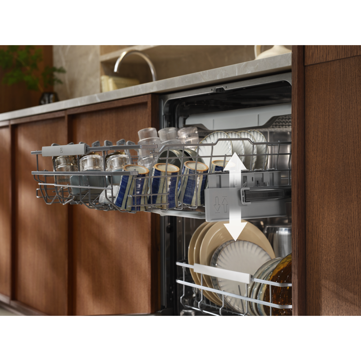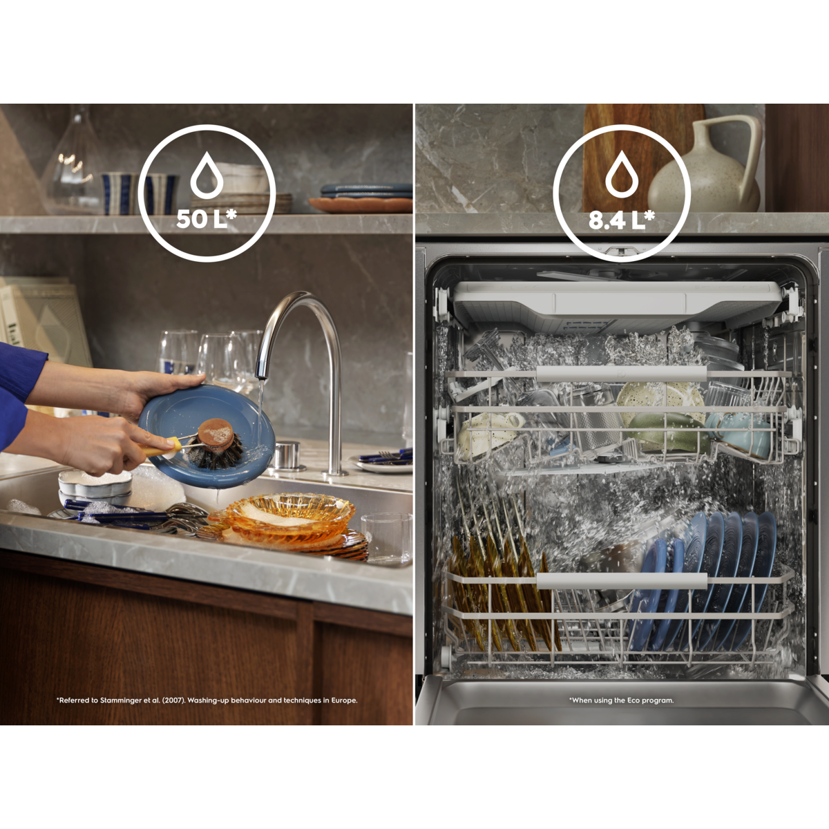 Stroje serija 700 lahko napolnite učinkovito in enostavno. Kristalno čista posoda z le 8,4 litra vode – preverite, kako enostavno se vaša posoda prilega v velike, prilagodljive košare z zložljivimi deli.