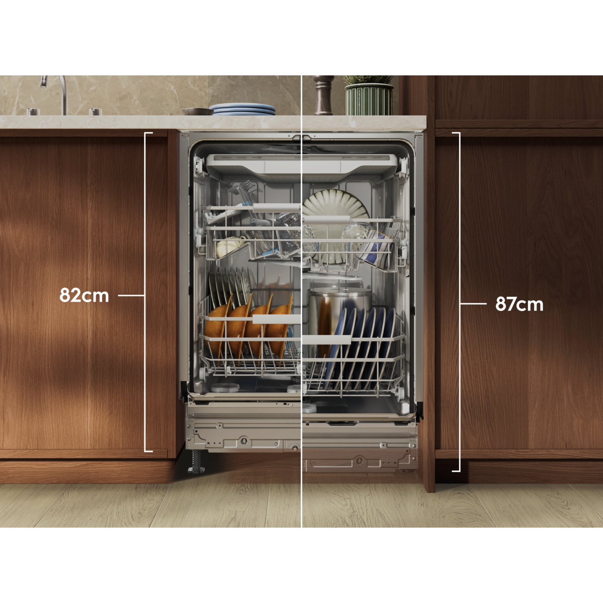 Pomivalni stroj 800 MaxiSpace je v notranjosti 5 cm višji, vendar se prilega standardnemu kuhinjskemu pultu. Zanesljivo odstrani trdovratne ostanke hrane in ima enostavno drseče košare z ročaji za kozarce. Zelo nizka poraba vode – le 8,4 litra.