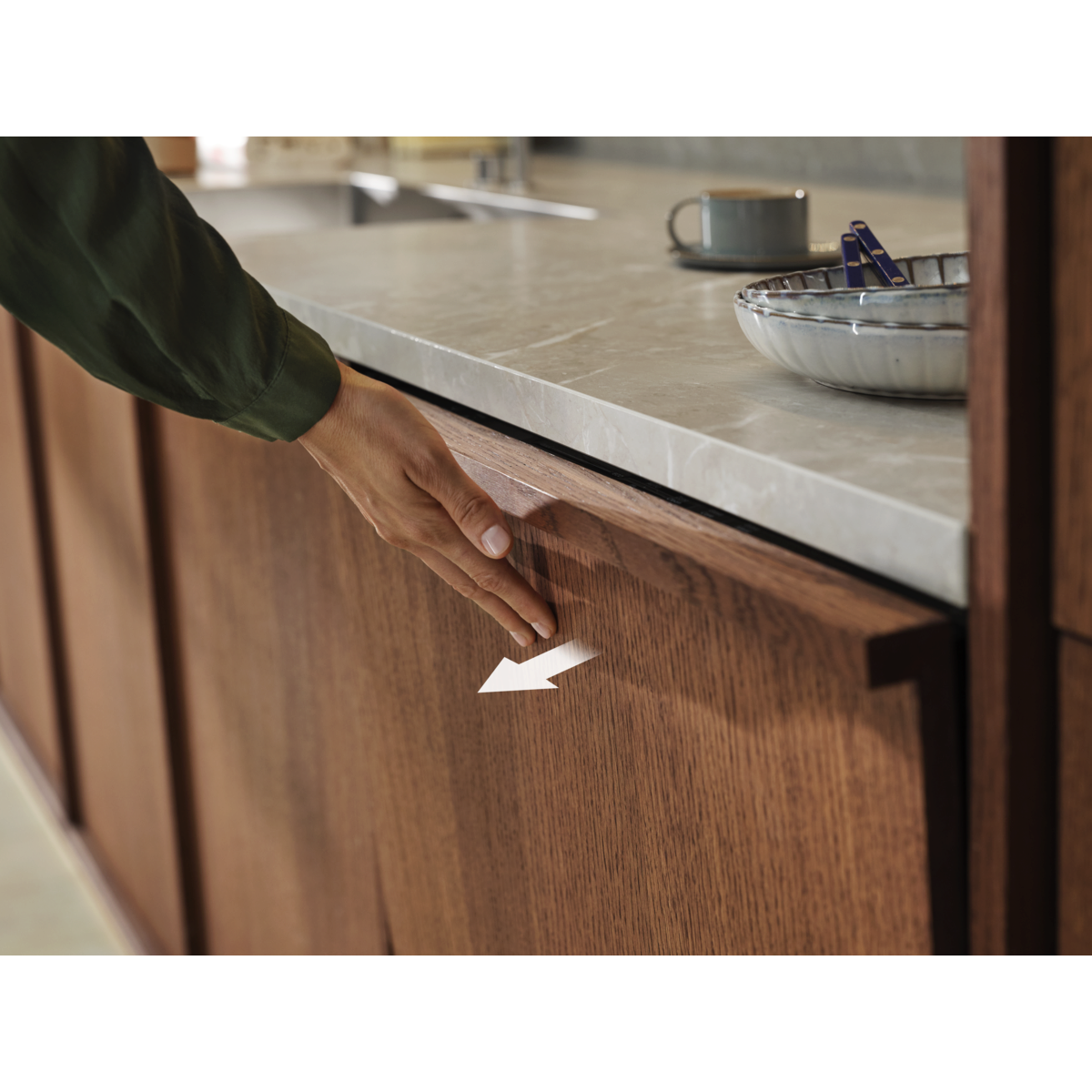 Vrata Push2Open nimajo vidnega ročaja, zato se pomivalni stroj neopazno zlije vašimi kuhinjskimi omaricami. Vrata odprete z rahlim pritiskom na zgornji del vrat.