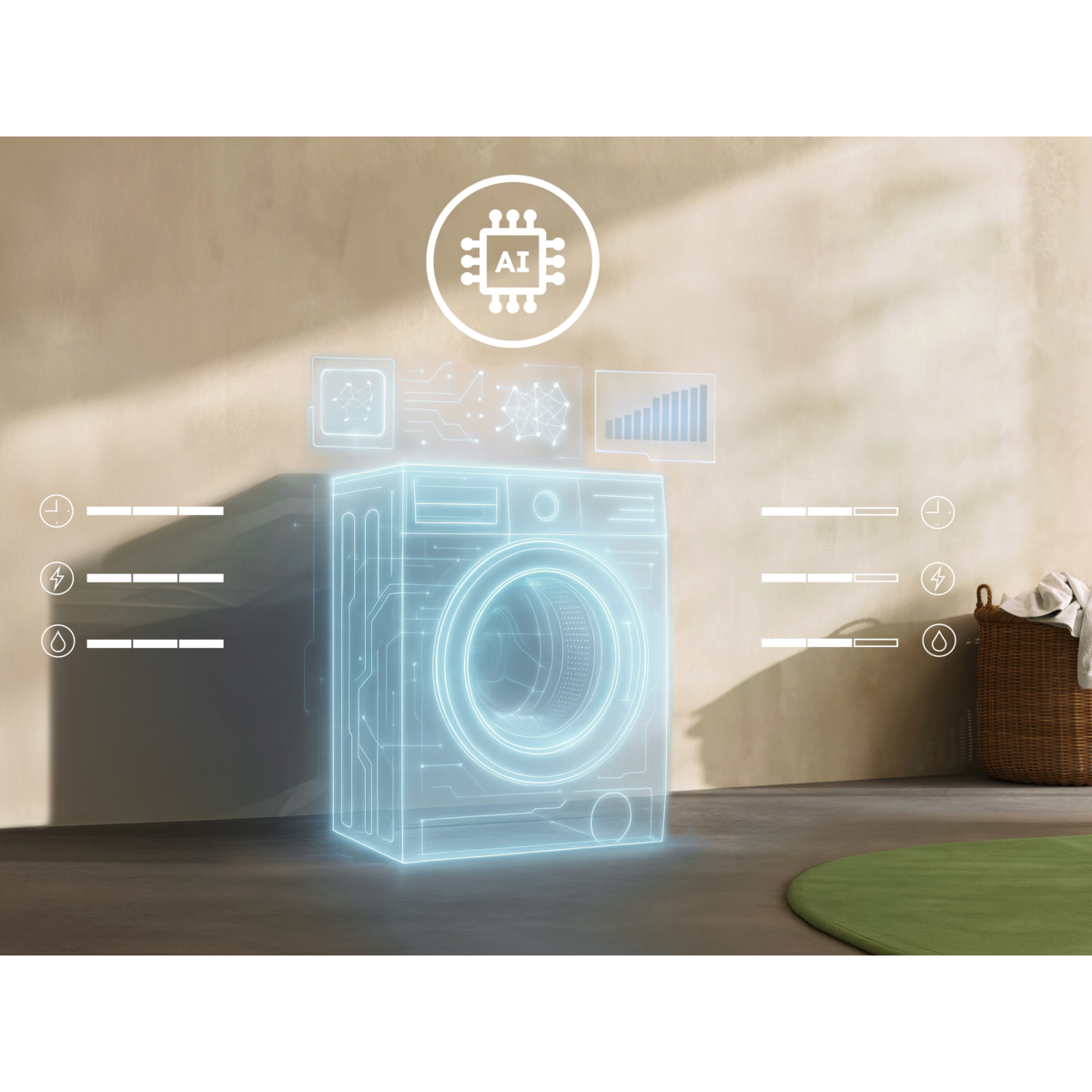 *Na podlagi algoritma zaznavanja perila, naučenega na podlagi različnih količin perila. Uporabniški podatki se ne uporabljajo za nadaljnje učenje UI.** Interni preizkus porabe časa, vode in energije za 1 kg perila v primerjavi z največjo količino perila pri ciklu bombaža 30 °C z AI WashAssist, ki prilagodi program glede na količino perila.