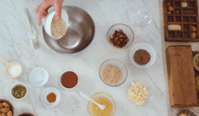 Z vilico zmešamo ovsene kosmiče, lanena in bučna semena, mlete mandlje, sol, pecilni prašek in cimet. Med zmešamo s čežano, mešanico pa nato dodamo prejšnjim sestavinam. Dodamo še maline, lešnike in belo čokolado ter dobro premešamo.
