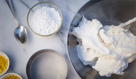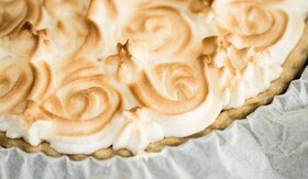Beljake stepamo, dokler ne postanejo čvrsti, nato dodamo rjavi sladkor in nadaljujemo stepanje. Ko končamo, z lopatico dodamo sladkor v prahu in dobro premešamo. Meringo vstavimo v vrečko za dekoriranje in z njo okrasimo pito.