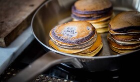 Pred serviranjem uporabimo nož, da olepšamo palačinke in poudarimo barve. Po vrhu polijemo karamelo in pojemo palačinke, dokler so še tople.