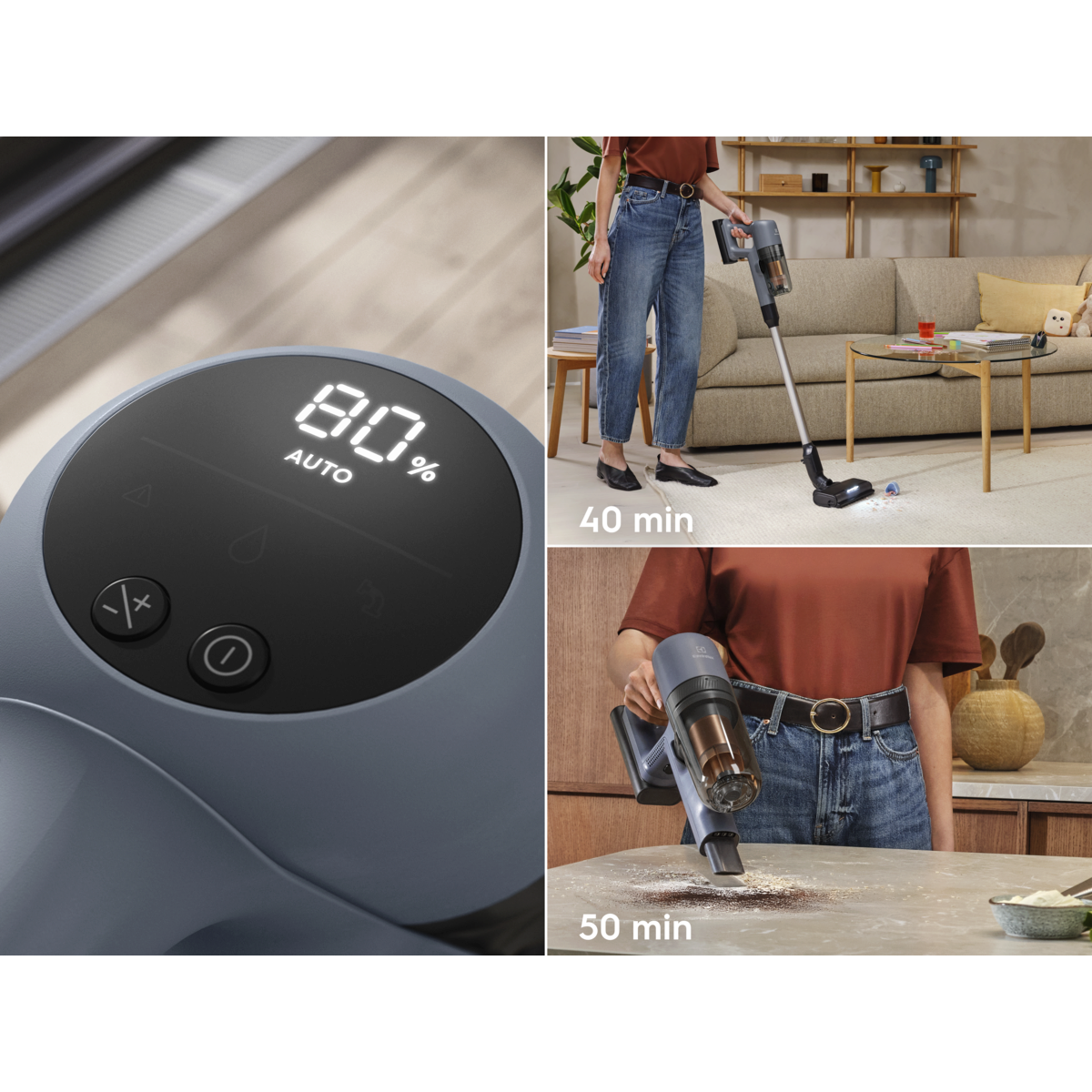 *V primerjavi s časom delovanja v načinu Boost. **Na podlagi internih preizkusov v skladu z IEC 62885-4, ki merijo čas delovanja ročne enote in celotnega sesalnika v min. načinu.
