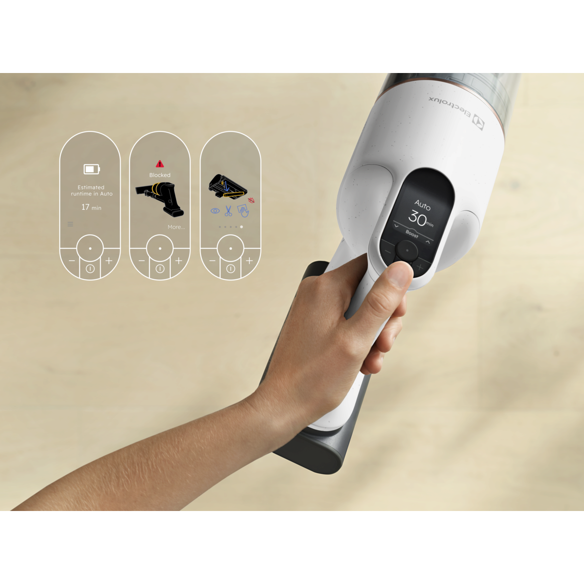 *Čas delovanja je bil izmerjen v načinu visoke hitrosti. Pobiranje prahu je bilo preizkušeno v skladu s standardom IEC 62885-2 ob upoštevanju povprečnega rezultata pobiranja prahu 5,2 oz. 5,3 (v obe smeri) na trdih tleh. Na podlagi primerjave s šestimi najbolje prodajanimi ročnimi sesalniki s ceno nad 490 EUR v štirih evropskih državah (od oktobra 2024 do septembra 2025).
